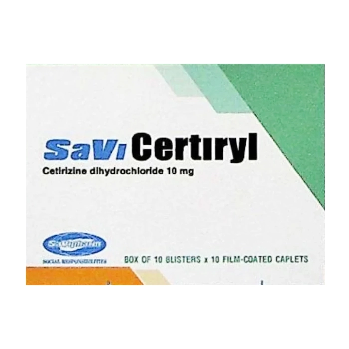 - SaViCertiryl được chỉ định để điều trị triệu chứng viêm mũi dị ứng dai dẳng, viêm mũi dị ứng theo mùa, mày đay mạn tính vô căn ở người lớn và trẻ em trên 12 tuổi và viêm mũi dị ứng theo mùa ở trẻ em trên 12 tuổi, viêm kết mạc dị ứng.